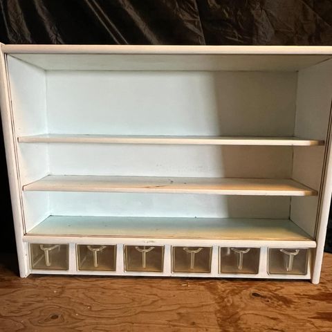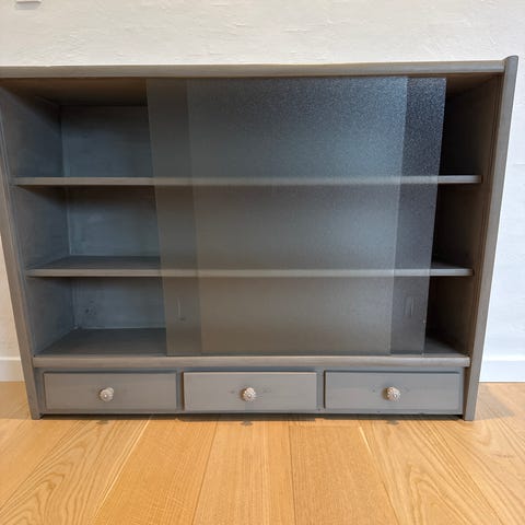 Køkkenskab i fyrretræ med egetræs lister. Skuffe huller er 16x10cm