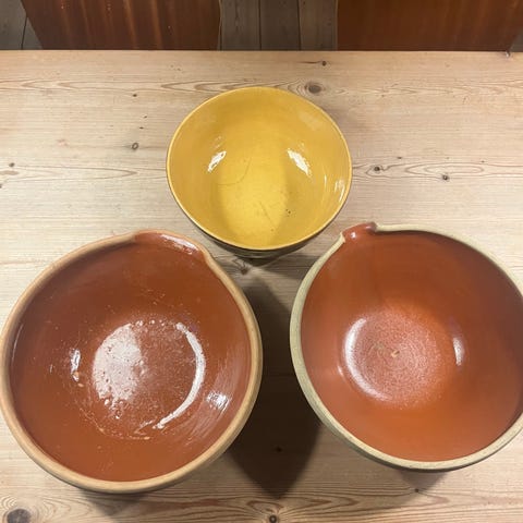 3 forskellige lerskåle. Den største på foto er 22 cm diameter. Samlet pris. sælgens samlet. Sender genre vis FIKSFÆRDIG eller direkte med GLS