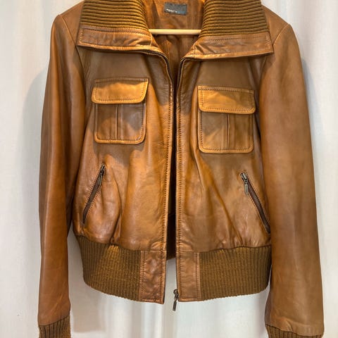 Læderjakke, str. 42, Nils, Super lækker læderjakke i kombination af læder og stof syet sammen med rigtig mange flotte detaljer. Pelskrave som kan knappes af hvis man ønsker det. Der er mange muligheder i denne jakke. Kun brugt max 5 gange! Nypris 3000kr! Sertifikat medfølger.