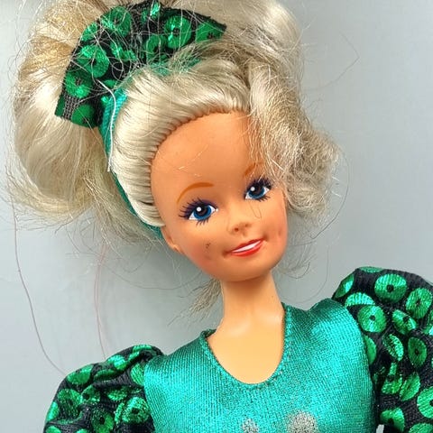 Strikket i lækkert i 100% baby alpaca. Dukken fejler ikke noget men ansigtet er lidt falmet. 45 cm lang. Og ja, hun ser sur ud!!