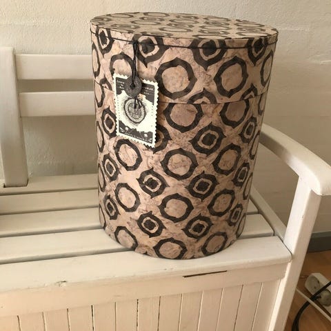 Hatteæske, mørkeblå / kongeblå med guldmønster, velour, retro fra begyndelsen af 1970'erne, velholdt, ser nærmest stadig ud som ny, kan også bruges til opbevaring af ting f.eks. af garn, etc. Eksklusiv udførelsen inden al ting blev produceret i Kina. Højde ca. 20 cm. Diameter ca. 29 cm.