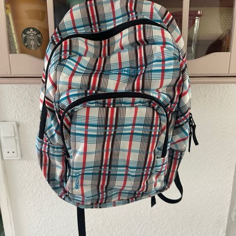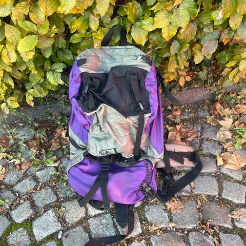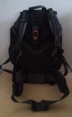 En indvendig lomme, to lange lommer på hver side, to lommer på toppen (ude og inde) og en lomme/lille taske på bærerem. Indbygget hætte på toppen. På fronten kan der åbnes ind til sækken og der er remme til sovepose/liggeunderlag.