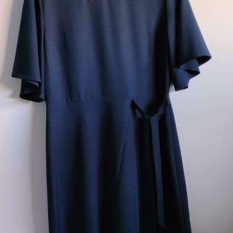 Mørkeblå kjole med små lyseblå blomster. Sort for. Kjolen er 87 cm lang. Over brystet måler den 2 x 54 cm. 100% polyester.