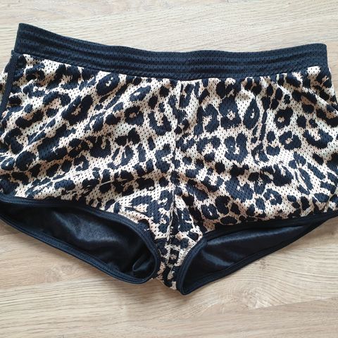 Røde leoshorts med sorte leokanter, lommer og elastik i taljen af danske Birgitte Herskind.