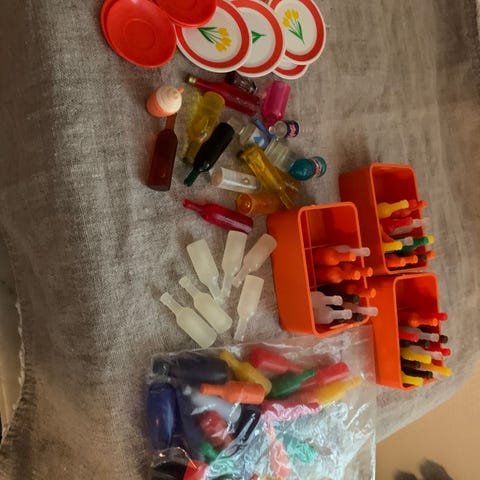 Retro testel i metal til dukkehus. Har brugsspor, kanden står bl.a. en smule skævt. Sælges samlet.