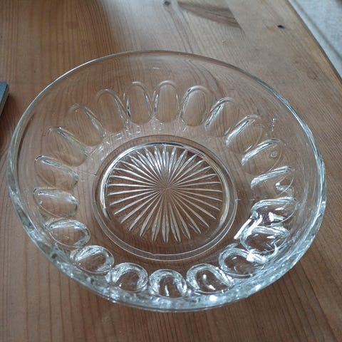 I klart glas, med bølget kant og meget, meget flot stjerne mønster i bunden.