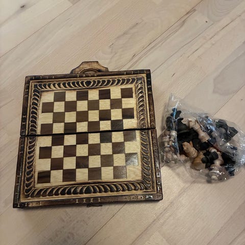Sammenklappeligt skakspil i lommeformat, 13x13 cm.