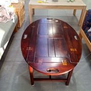 Butlerbord, brugsmærker på bordpladen, men et pænt og elegant bord. Bordpladen kan løftes af som en serveringsbakke, og understellet kan klappes sammen.