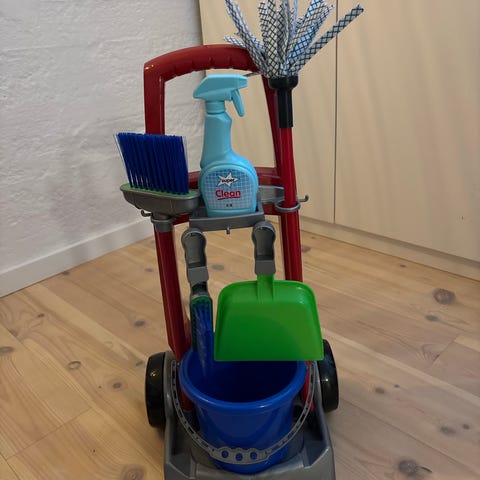 Denne rengøringstrolley er et sjovt og lærende legetøj til børn fra 3 år. Trolleyen kommer med flere tilbehør, herunder en moppe, en spand, en kost, en håndkost og en fejebakke. Den er perfekt til børn, der elsker at hjælpe med husarbejdet.