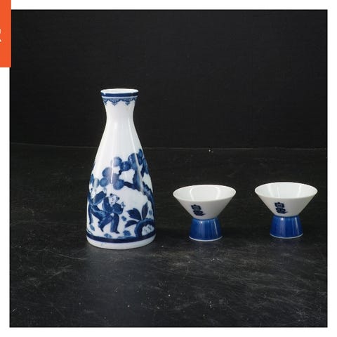 En mindre flaske / kande. Sake flaske. ( eller brug den til mælkekande til kaffen)måler ca 13 cm i hj . En lille drikke glas til ( svarer til et snapseglas)måler ca 6 cm i hj