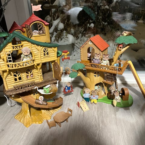 Et rigtig fint træhus med sjove detaljer, som fx hængekøjer.