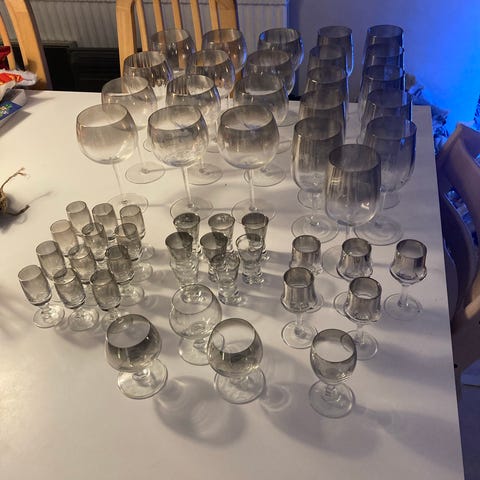 Glas, 44 Crystal glas, 44 Flotte crystal glas. 9 rødvin 18 høj. 13 hvidvin 16,5 høj. 6 portvin 14 høj. 7 snaps 10,5 høj. 7 likør 9,5 høj. 2 cognac 10 høj. De er rigtige gode til fest. Samlet pris alle glas 800 kr. Se også mine andre annoncer. Hv123