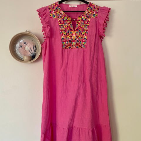 Sød Rosablomstret sommerkjole med smock over bryst. Falder rigtig flot. Str. M, bryst: 94 cm, længde: 120 cm.