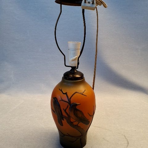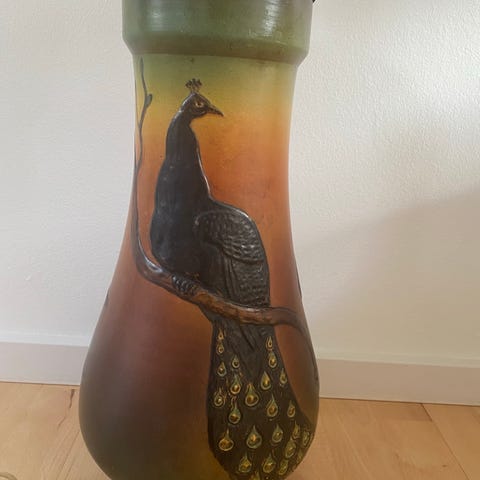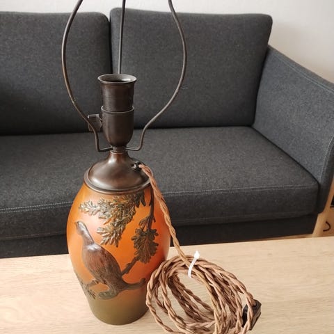 Smuk keramiklampe. Lampe i håndmalet glaseret keramik med fugle og grene.