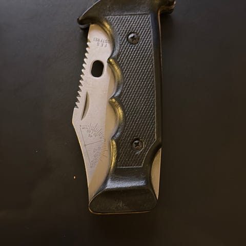 Camp Buddy foldekniv, Sort foldekniv med sort nylon etui samt magnesium ildstål med oplukker samt 5 cm. lineal.