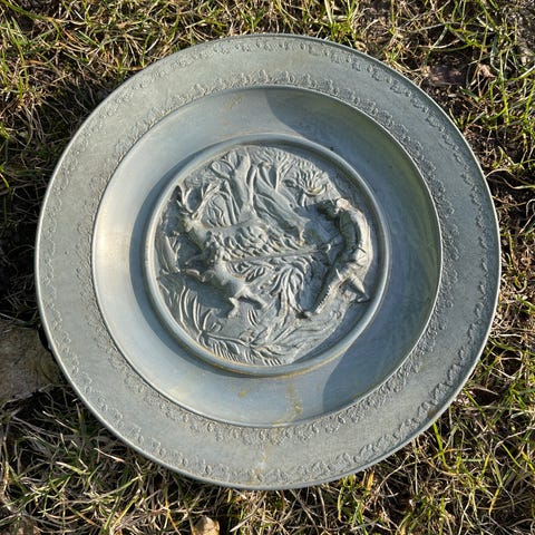 Platte I tin Ø. 32 cm. Vægt 1215 g.