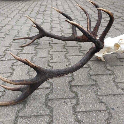 Jagttrofæ, Kronhjort, Stort og smukt kronhjortegevir monteret på en flot mørkebrun træplade.