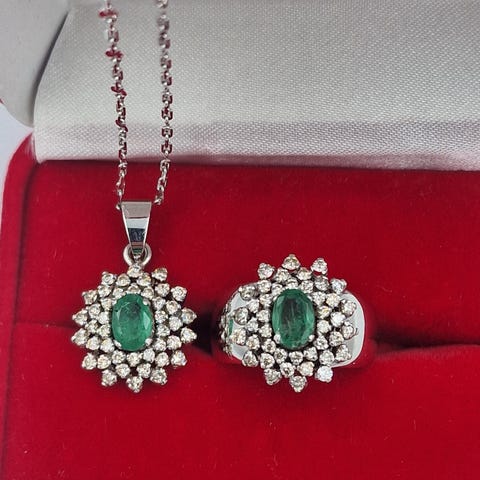 Består af ring, ørestikker og vedhæng. Vejer 9 gram uden kæde, der er lavet af sølv, men følger med.