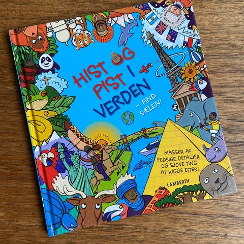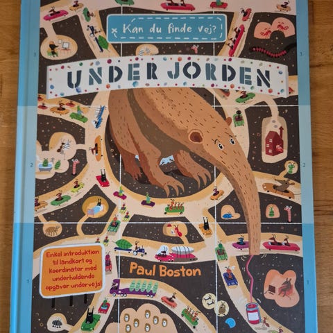 Myldrebog med flotte farverige og detaljerede illustrationer, der giver en enkel og underholdende introduktion til kort og koordinatsystemer.