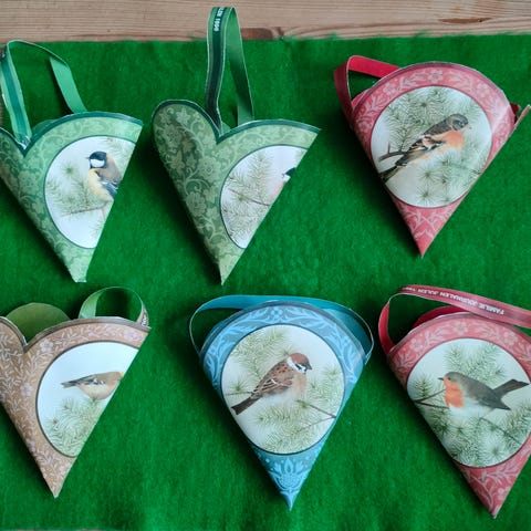 Karen K. Julehjerter, kræmmerhus, retro, julepynt, Fem søde papirs-ophæng med motiver af Karen K.!