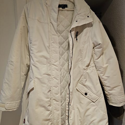 Vinterfrakke, str. 36, -, Hvid, 60 % polyester, 37 % viskose, 3 % elasthan, God men brugt, Pæn lækker frakke