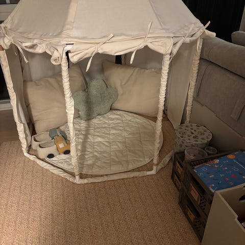 Vi har kun brugt det som telt, men som jeg forstår det så kan man starte med at bruge stativet som deres puslebord The Changing Tower.