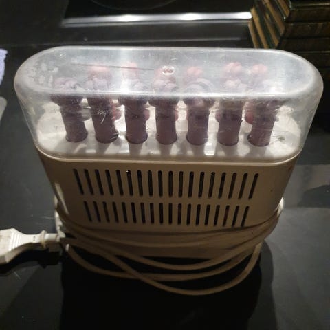 Der er også et krøllejern - med varme - det er sort (igen se billedet)