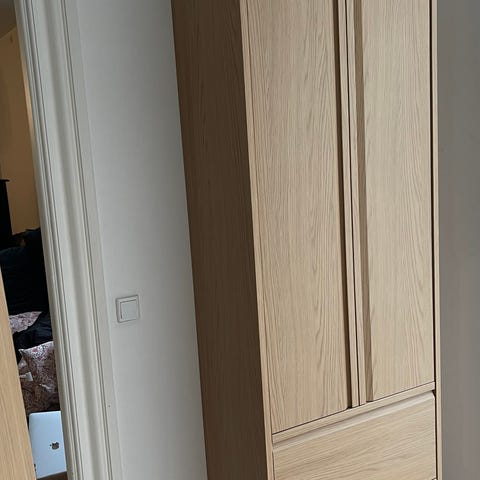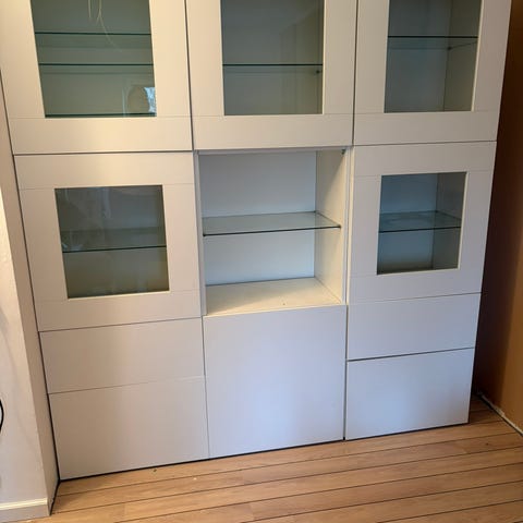 Ängsjön højskab med dør i hvid højglans. Med glas og træ hylder. Købt i juni 2024 for 1700 kr. sælges samlet