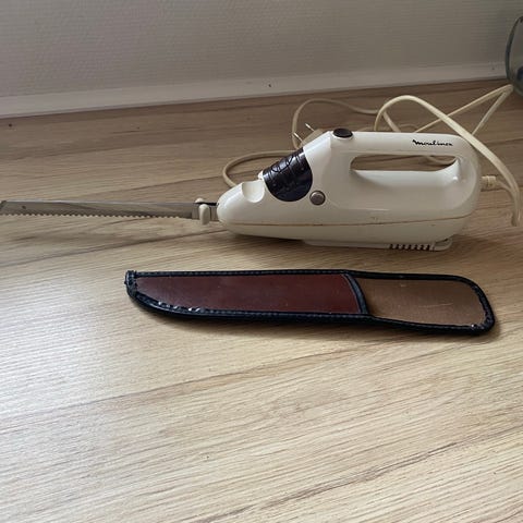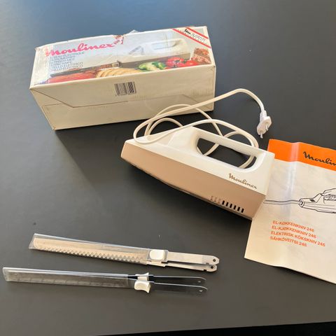 El-kniv, Moulinex, Ældre fuld funktionsdygtig el-kniv med 2 klinger sælges. Der medfølger brugsanvisning og original æske. Den kan skære i dybfrost, kød og brød. Den tåler opvaskemaskine. Klingerne skal ikke slibes, da de er fremstillet af hærdet rustfrit stål.