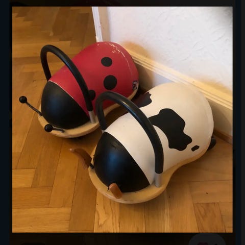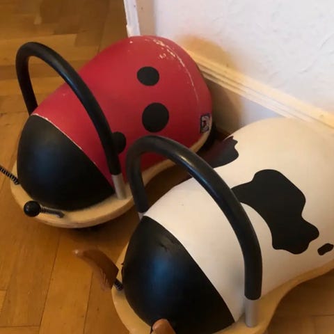 Den store model, af den prisvindende originale håndlavede Wheely Bug Bi, er en fantastisk skubber/gåbil. Ud over det søde og farvestålende udseende adskiller den sig fra mere traditionelle gåbiler, ved at have hjul, der drejer 360°. Dette udfordrer de motoriske evner og fremmer barnets grov motorik. Wheely Bug'en er ergonomisk rundet, så den er behagelig for børnene at sidde på.