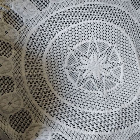Flot rund hvid dug fomodentlig hånd hæklet. Den er nyvasket men der er en større skjold som ikke gik af i første vask samt et lille hul som nemt kan repareres. Se sidste billede.