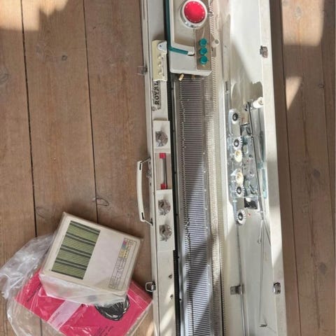 Alt er med og brugt meget lidt. Der er også alle instruktionsbøger, flere strikkeopskrifter, strikkegarn, div. redskaber og bordet den står på følger også med.