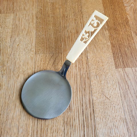 Unik kagespade i rustfrit stål med skaft i udskåret ben.