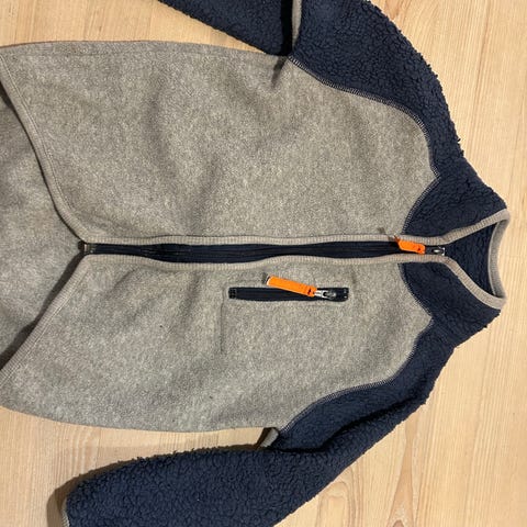 Molo fleece er de bedste, synes jeg! Her en dejlig grå fleece med ekstra længde på ærmer og hul til tommelfingrene. Stand er god men brugt. Mange timers leg tilbage i denne trøje!