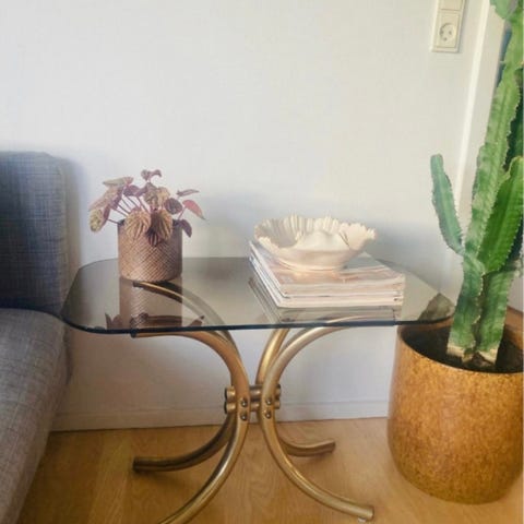 Flot sidebord, sofabord og glasbord med råt forgyldt stel med røgfarvet massiv glasplade.