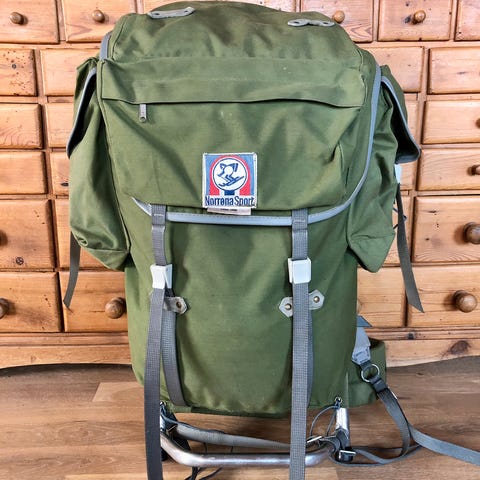Fed rygsæk i lilla og blå. Medfølger to sidelommer. Brugt, men har mange år i sig endnu.
