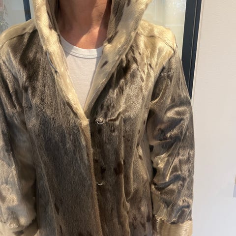 Pelsen er sortfarvet/sortbrun sæl. Den har lukning med hægter og knap i halsen. Den har to indvendige lommer og hætte. Striberne er samme materiale blot hvor pelsretningen er vendt om.