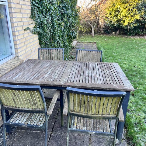 De 3 af stolene har stået inden, den 4 har stået i skur. Bord har stået ude.