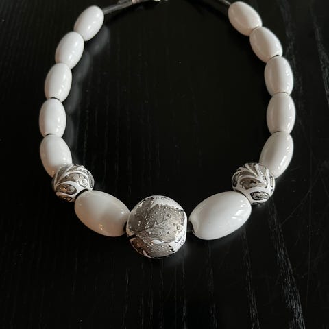 Superfin og klædelig halskæde med hvide perler. Lidt anderledes, men rigtig fin også til en højhalset bluse. Ældre men aldrig brugt. Ingen skader. Min. L. 33cm. Max. L. 40cm. Pris kun 145,-kr. +evt. Porto. Sender gerne. Se også mine andre annoncer med bl.a. smykker.