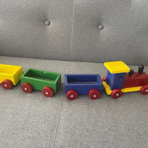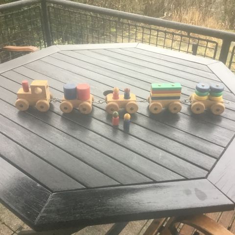Trætog, Gammelt og velbrugt trætog, hvor fyrbøderen stikker hovedet op og ned af taget, når toget kører.