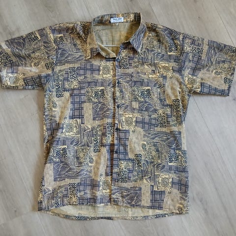 Skøn vintage skjorte i fed kraftig silke fra "Burma Bilbas". Der er ingen størrelse i, men vurderer det til en M. Mønsteret er meget smukt.