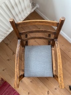 Fin gammel børnegyngestol. Nybetrukket sæde. Stabil og intakt. Siddehøjde ca. 28/29 cm. Højde ryg ca 58 cm.