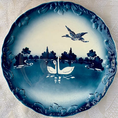 Fin vægplatte / tallerken i keramik/fajance med art nouveau dekoration: Lilla valmue på flødefarvet bund. Med ophæng. God stand.