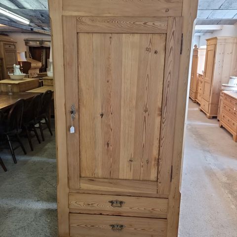Gammelt antik skab i afsyret fyrretræ med hylder indvendig samt en skuffe forneden. Restaureret og fået bivoks.