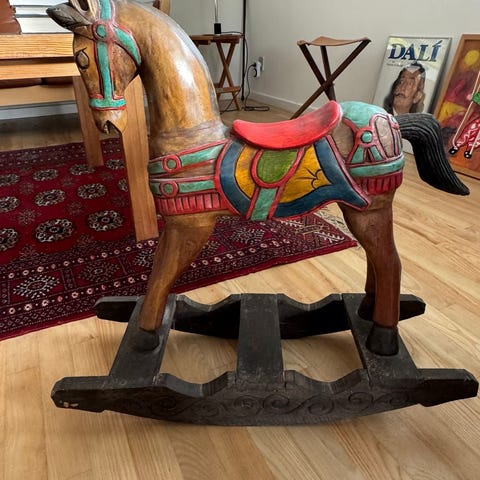 Gammel Gyngehest at ukendt herkomst. 79 cm lang. 74 cm høj. Minimum 80 år gammel Fin som pynt og kan også gynge. Seletøj er knækket