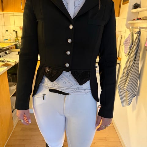 Stævne jakke i mørkeblå med trykknapper i str 34. Den sidder rigtig godt. Kan vaskes i vaskemaskine. Brugt få gange. Købt i Frankrig.
