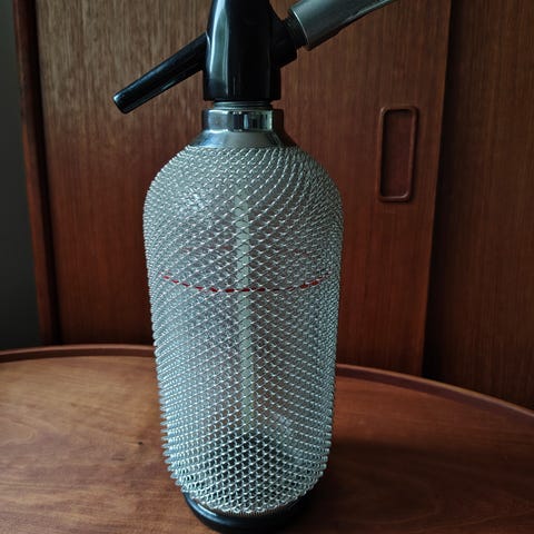 Meget flot gammel fransk sifonflaske i blå glas med skriften, Sarrazin St. Genis.