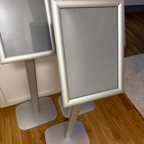 3 Infostandere. Rund stålfod Ø17 cm, Total højde 110 cm. Display størrelse 19*27,5 cm. 1 stk 100, - 3 stk 250,-