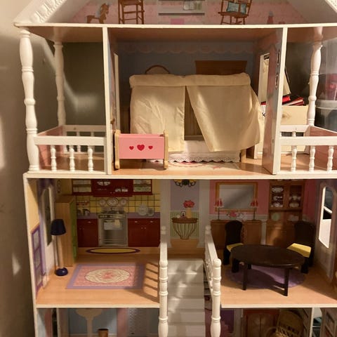Dukkehus, et plan dukkehus i træ, med køkken og sovepladser, udepejs og toilet, sansegynge, parasol m.m.....næsten alt i træ...sælges med indholdet....H 17 B 27 L 45.kan efter aftale ses ved Haslev eller sendes......se også mine andre annoncer på dukkehuse