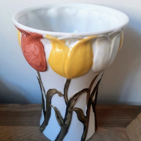 Vase, Vase, Vintage, Vintage vase formet som tulipan Rosa og hvid Højde: ca 16 cm Bredde: for oven ca 6,5 cm, bredeste sted ca 11,5 cm Usikker på materiale, tror det er keramik Anelse nus se billeder